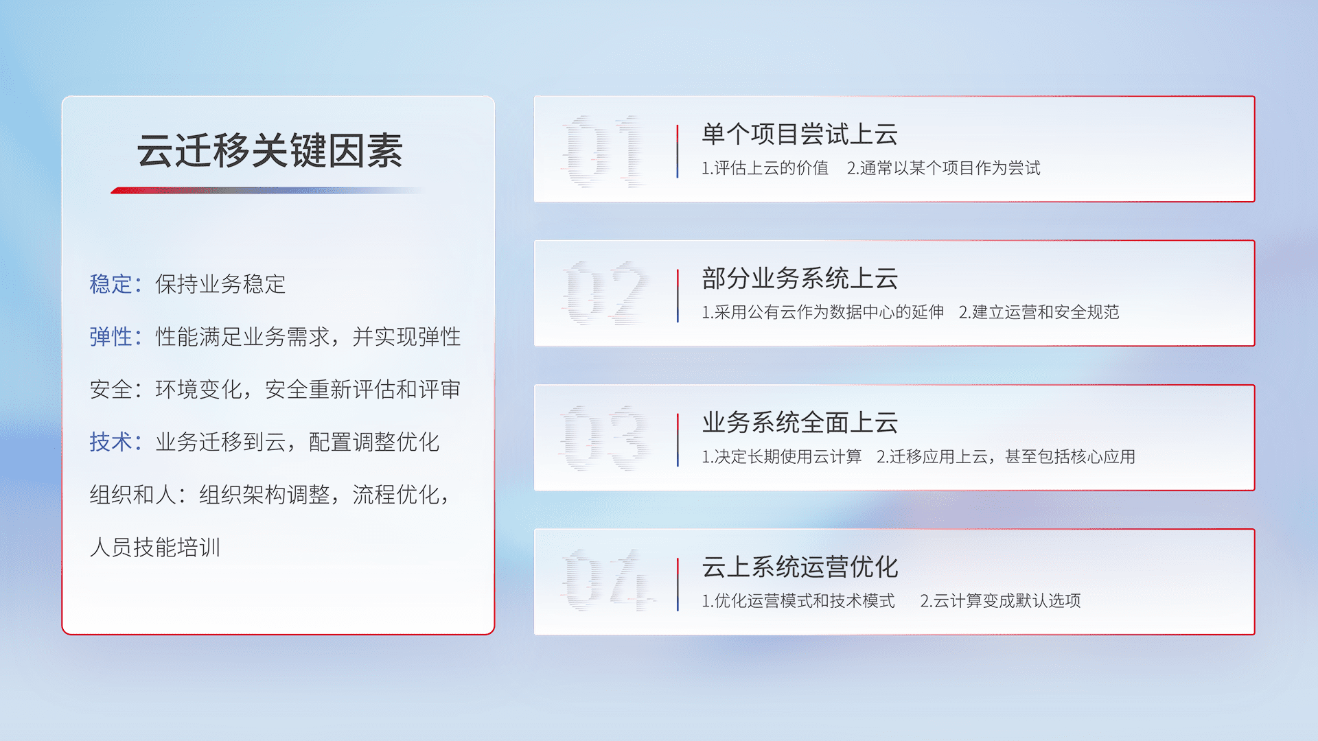 结合实际业务,,,,从规划设计、、、、云平台选型、、云原生改造、、、、数据迁移、、、、集成交付,,迁移全过程为客户识别最佳上云路径,,,,做好风险识别管理,,,,设计网络架构、、身份权限、、、、安全审计合规、、、、操作审计、、、、日志审计、、、、监控告警策略、、、、多站点容灾设计等,,,,对云上基础设施进行整体规划,,,提升IT治理水平,,,,以满足弹性、、、、高可用、、、、高性能的需求。。