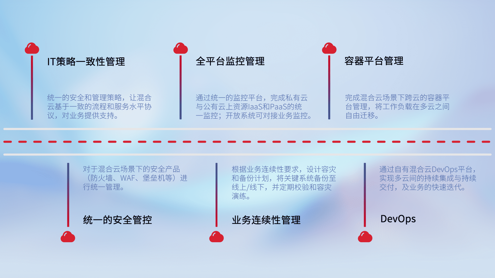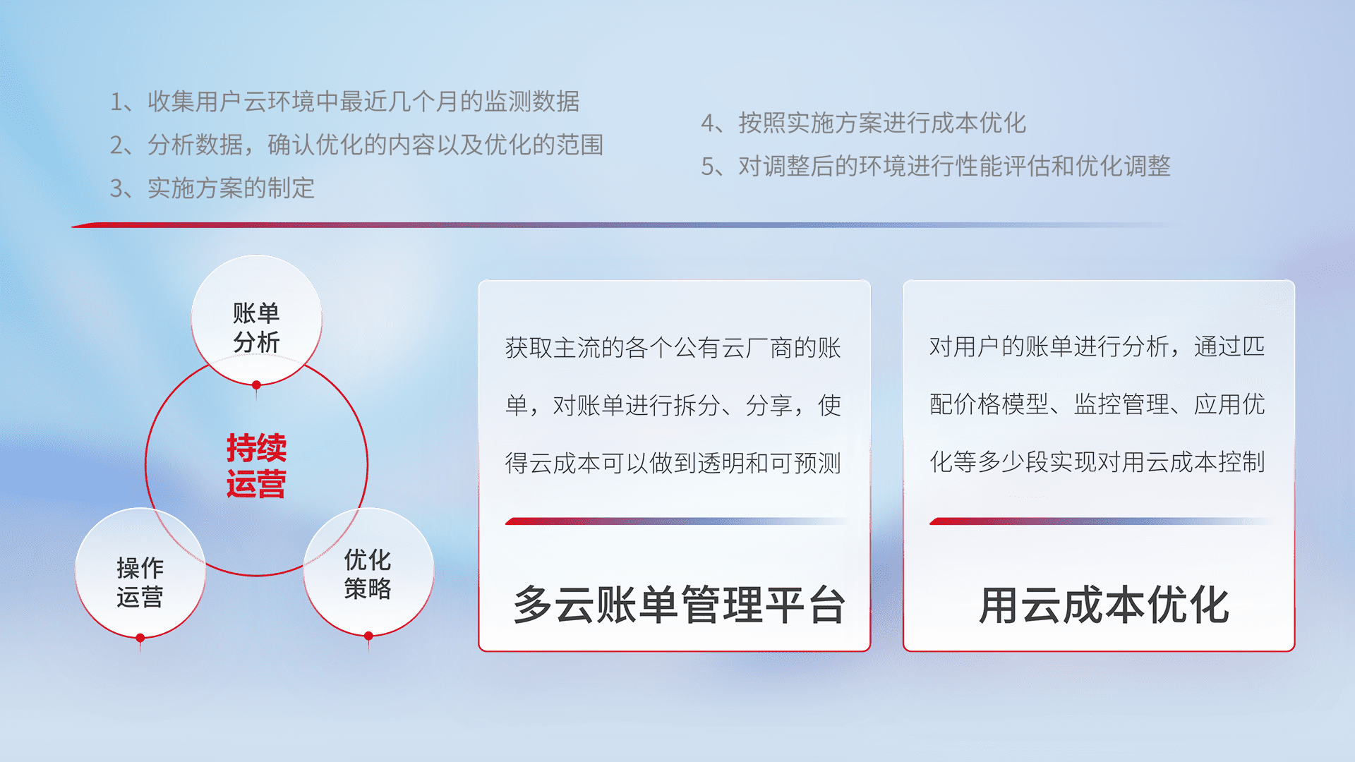 通过多云纳管,,以统一的资源数据模型把客户的云资源进行抽象和封装,,进而实现对多云资源的统一操作,,,,保障云资源管理的可靠性、、、、稳定性与可用性。。。量身定制化运维内容,,,配置、、、、开发运维、、补丁管理、、备份、、、监控、、认证和访问管理、、、、审计和日常巡检等,,,保障在用云过程中的可靠度,,,,稳定度以及高可用率。。。