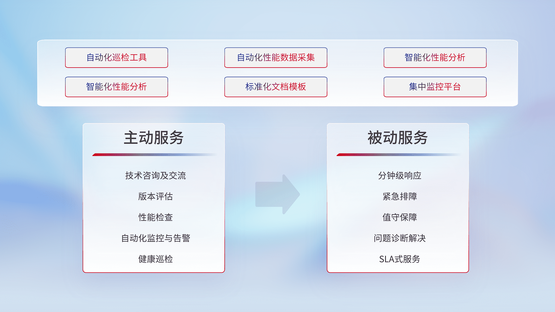 智能化工具和标准化文档,,保障服务质量,,,提供主动服务(包含技术咨询、、版本评估、、、、性能检查、、、、自动化监控与告警、、、、健康巡检)和被动服务包含(分钟级响应、、、、紧急排障、、值守保障、、、、问题诊断解决、、、、SLA服务)。。。